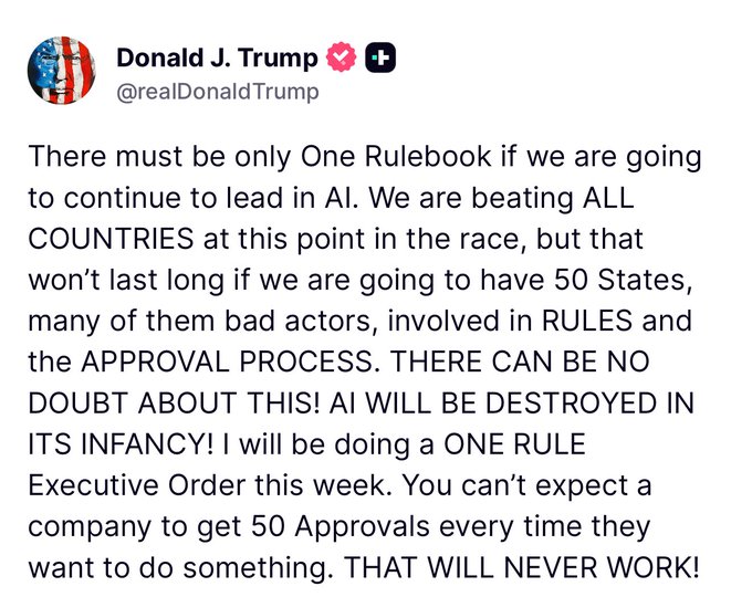 “우리가 AI 분야를 계속 선도하려면 규칙집은 하나만 있어야 합니다.”