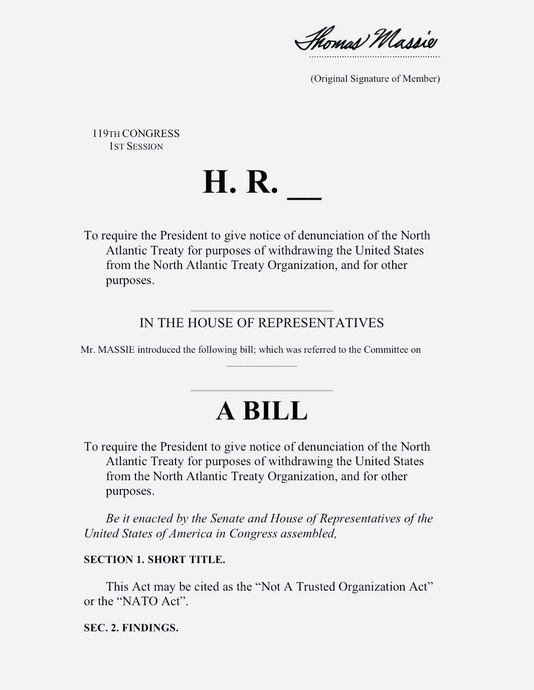 2025년 12월 10일, 토머스 매시 하원의원은 “신뢰할 수 없는 조직법(Not A Trusted Organization Act)” , 또는 간단히 “나토법(NATO Act)” 이라고 불리는 HR 6508 법안을 발의했습니다 . 이는 단순한 상징적 제스처가 아닙니다. 미국이 북대서양조약기구(NATO)에서 완전히 탈퇴 하기 위한 공식적인 의회 차원의 조치입니다 .