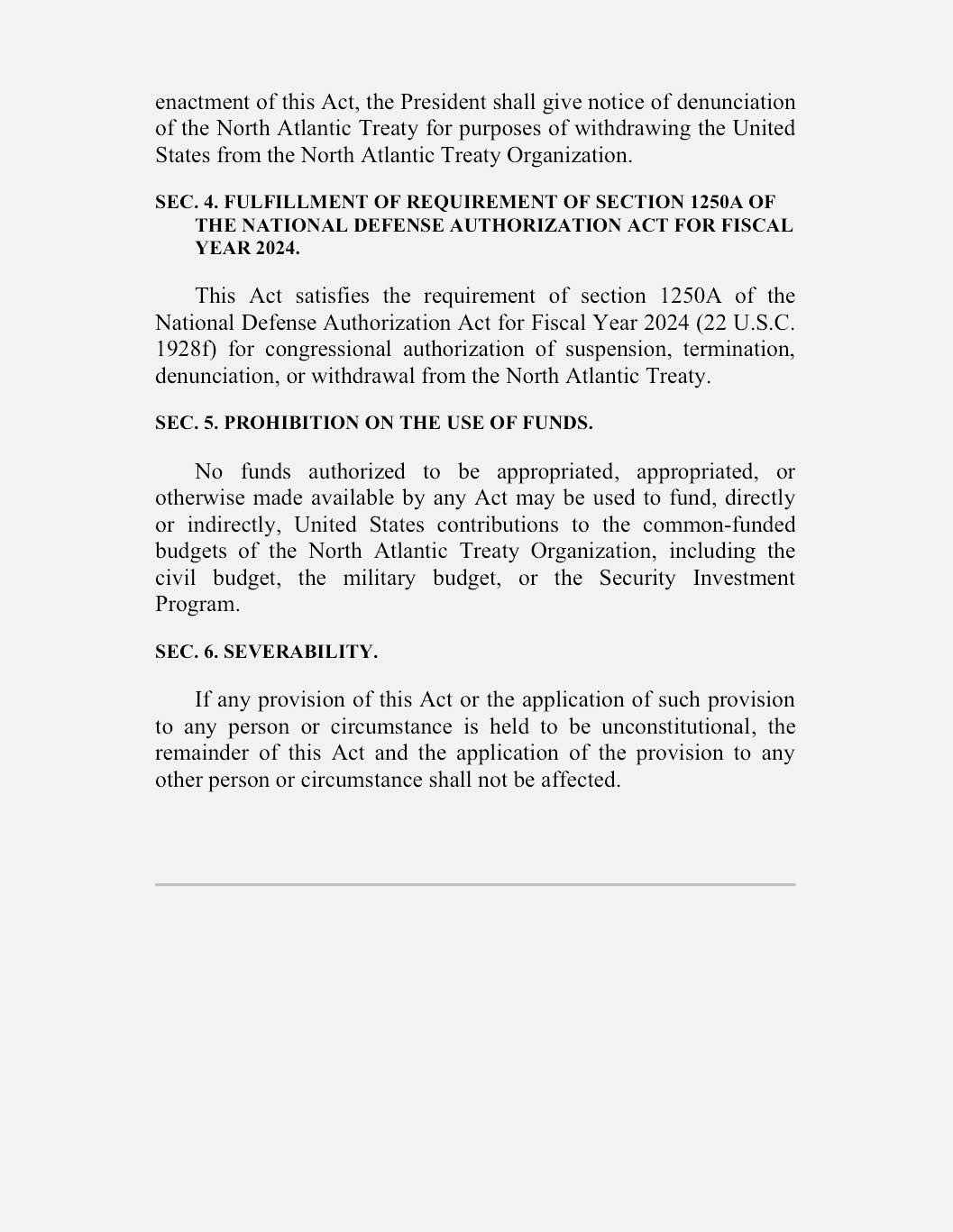 이 법안은 단순히 탈퇴만을 요구하는 것이 아니라 , 나토가 더 이상 미국의 이익과 부합하지 않는 이유를 조목조목 설명하고 있습니다 .